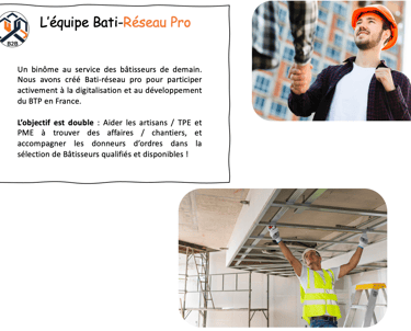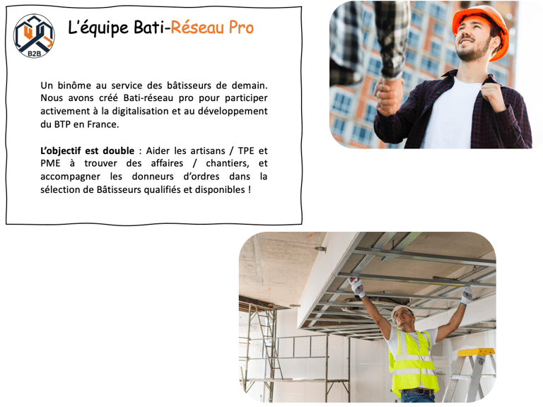 Bati Réseau Pro est né d’une conviction simple : le BTP mérite des outils modernes pour connecter les bons professionnels, plus vite et plus efficacement. Notre mission ? Simplifier la mise en relation entre artisans, PME et donneurs d’ordres pour booster l’activité de chacun.